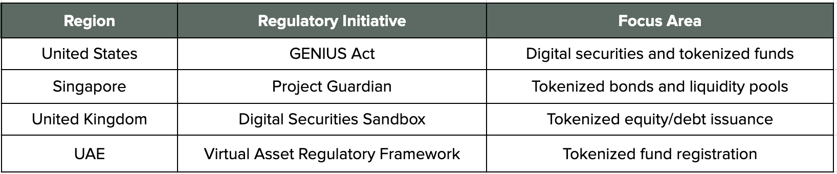 As tokenization scales, regulators are introducing frameworks to promote safe institutional adoption. Several global jurisdictions have launched structured pilot programs and sandboxes: