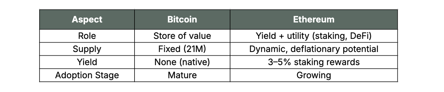 Where Bitcoin primarily offers defensive value, Ethereum provides offensive value — specifically, the ability to generate active yield through blockchain participation.